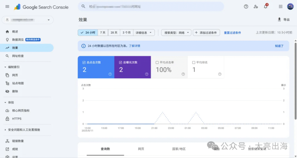 • 等待数据收集(通常 1-2 天)后,可以看到关键词曝光量、点击率、排名等 SEO 数据。