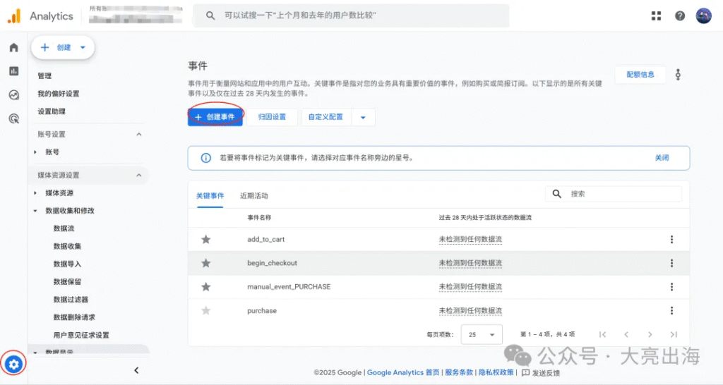 GA4 后台 → 配置 → 事件 → 创建事件 → 设定触发条件(按钮 ID、URL 等)。